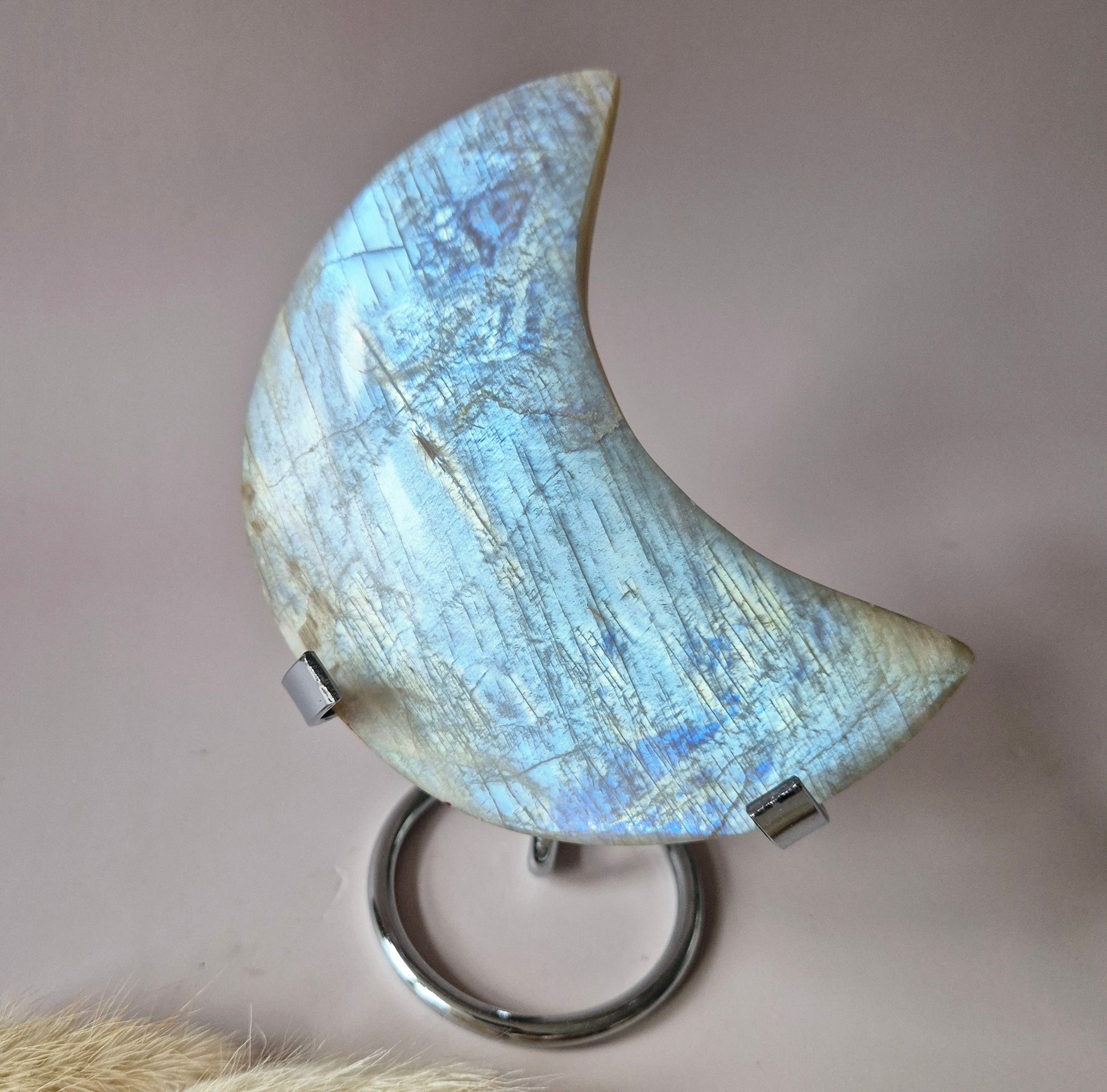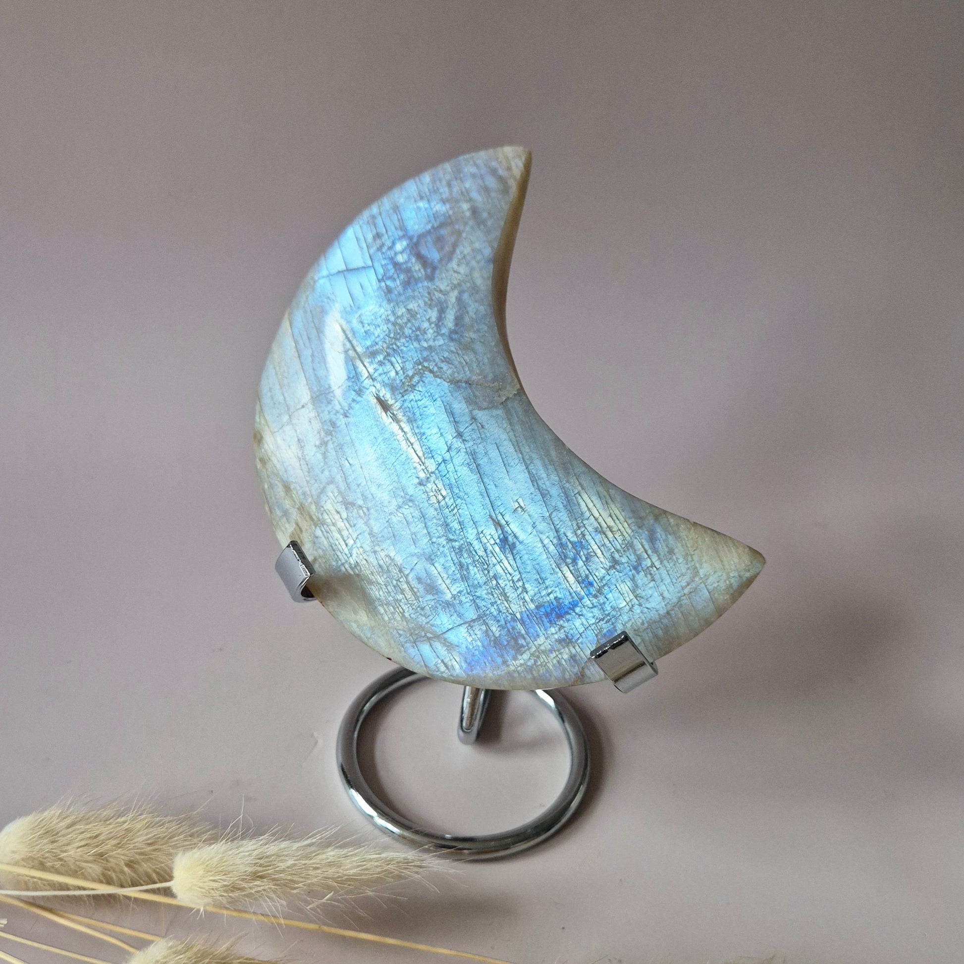 XL Blauwe Maansteen Maan op Standaard – 268 gram Met Prachtige Flash