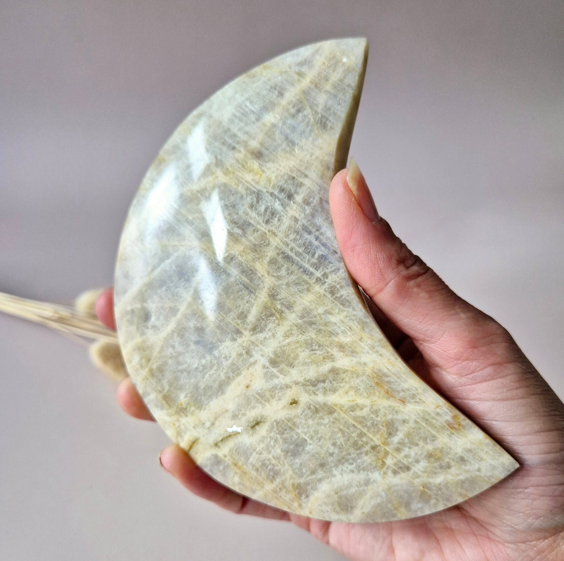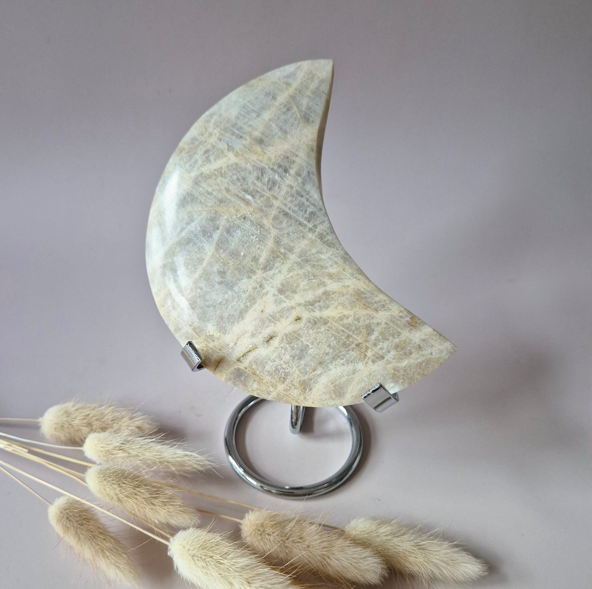 XL Blauwe Maansteen Maan op Standaard – 279 gram Met Prachtige Flash