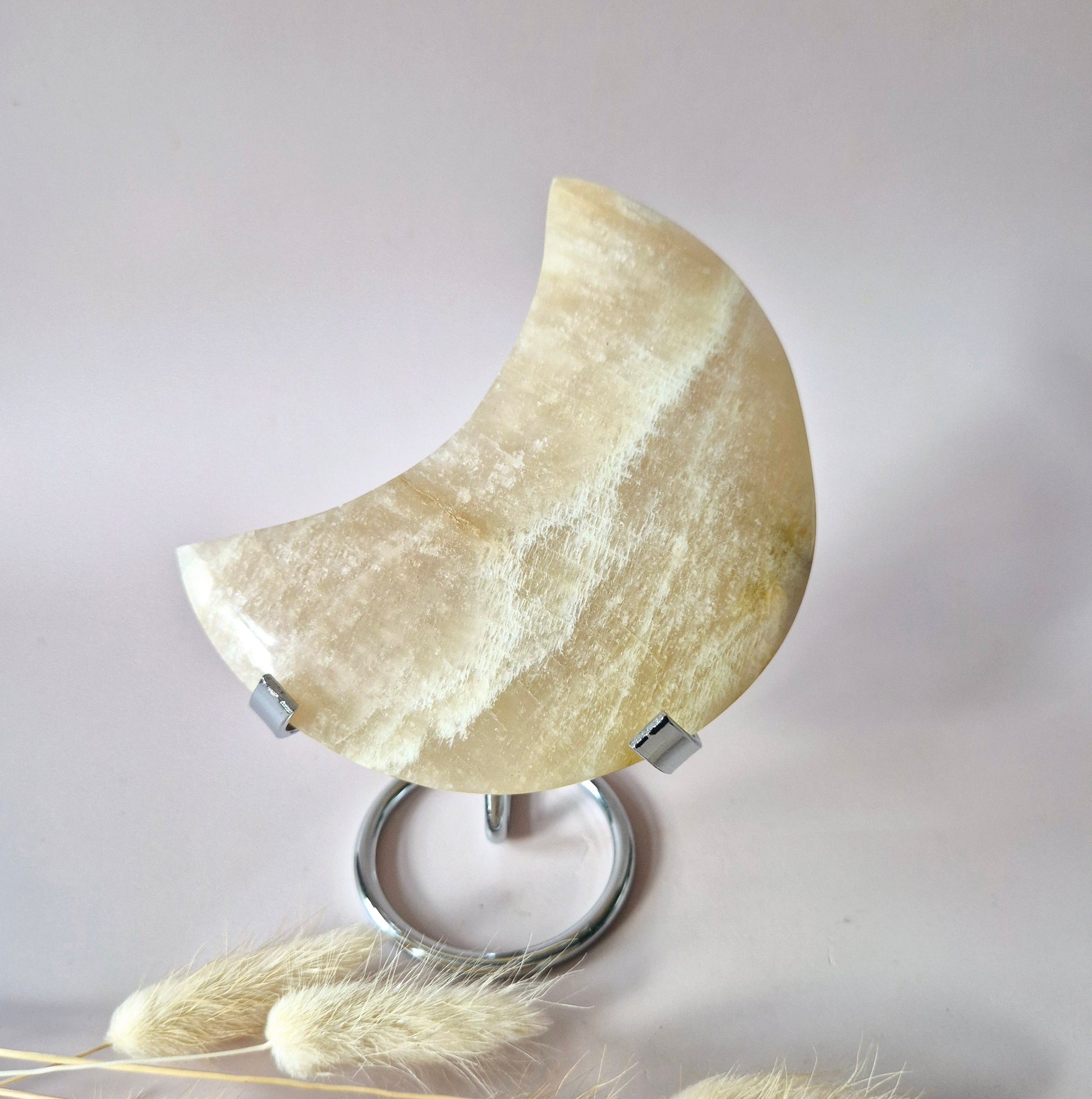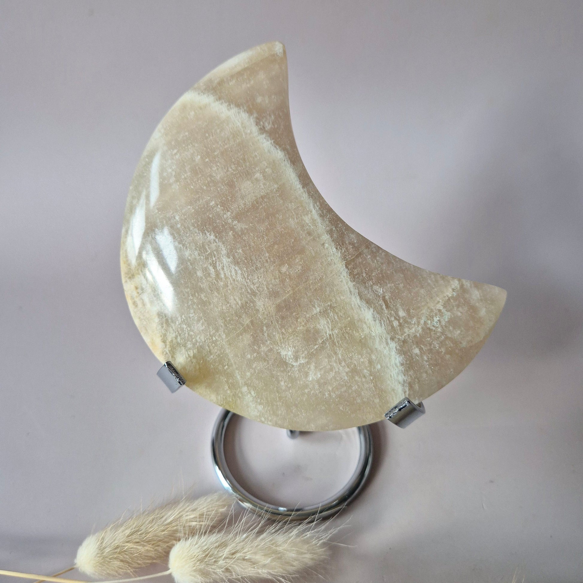 XL Blauwe maansteen maan op metalen standaard – 300g | Steen van vrouwelijke energie & intuïtie