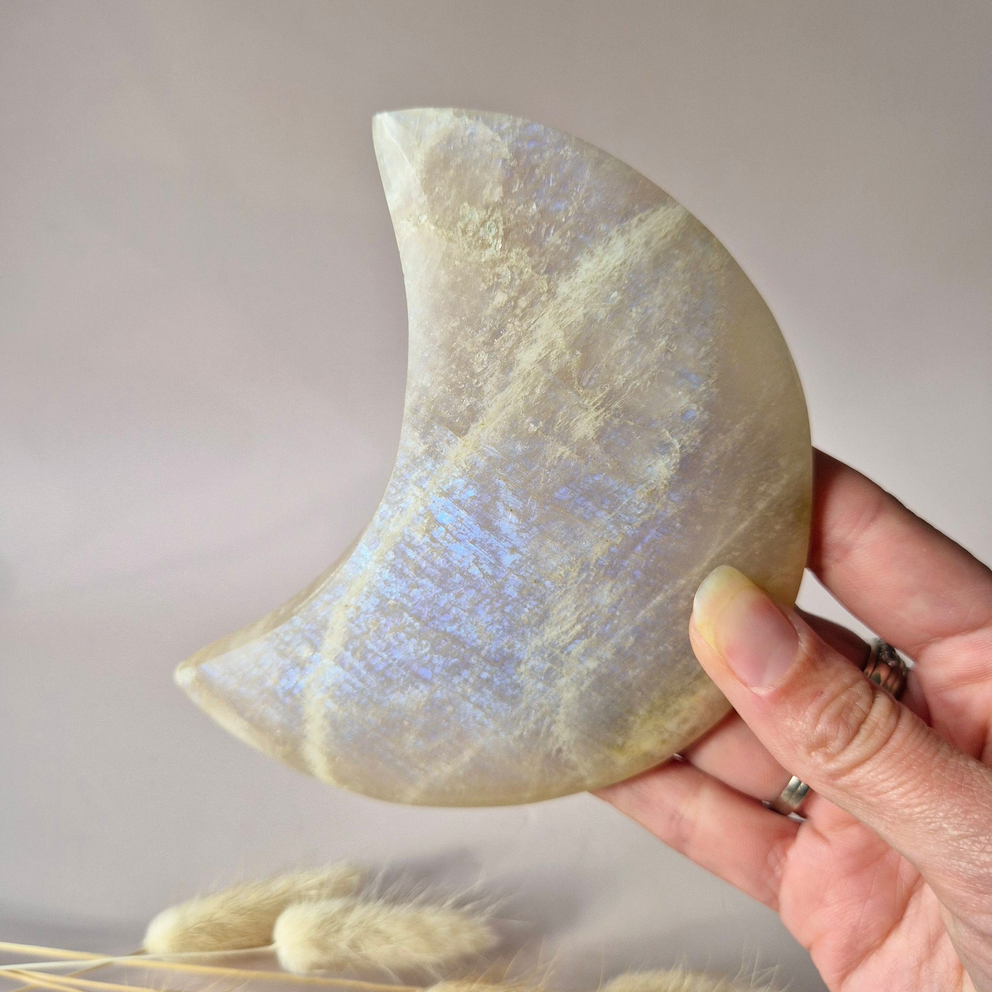 XL Blauwe Maansteen Maan op Standaard – 300 gram Met Prachtige Flash