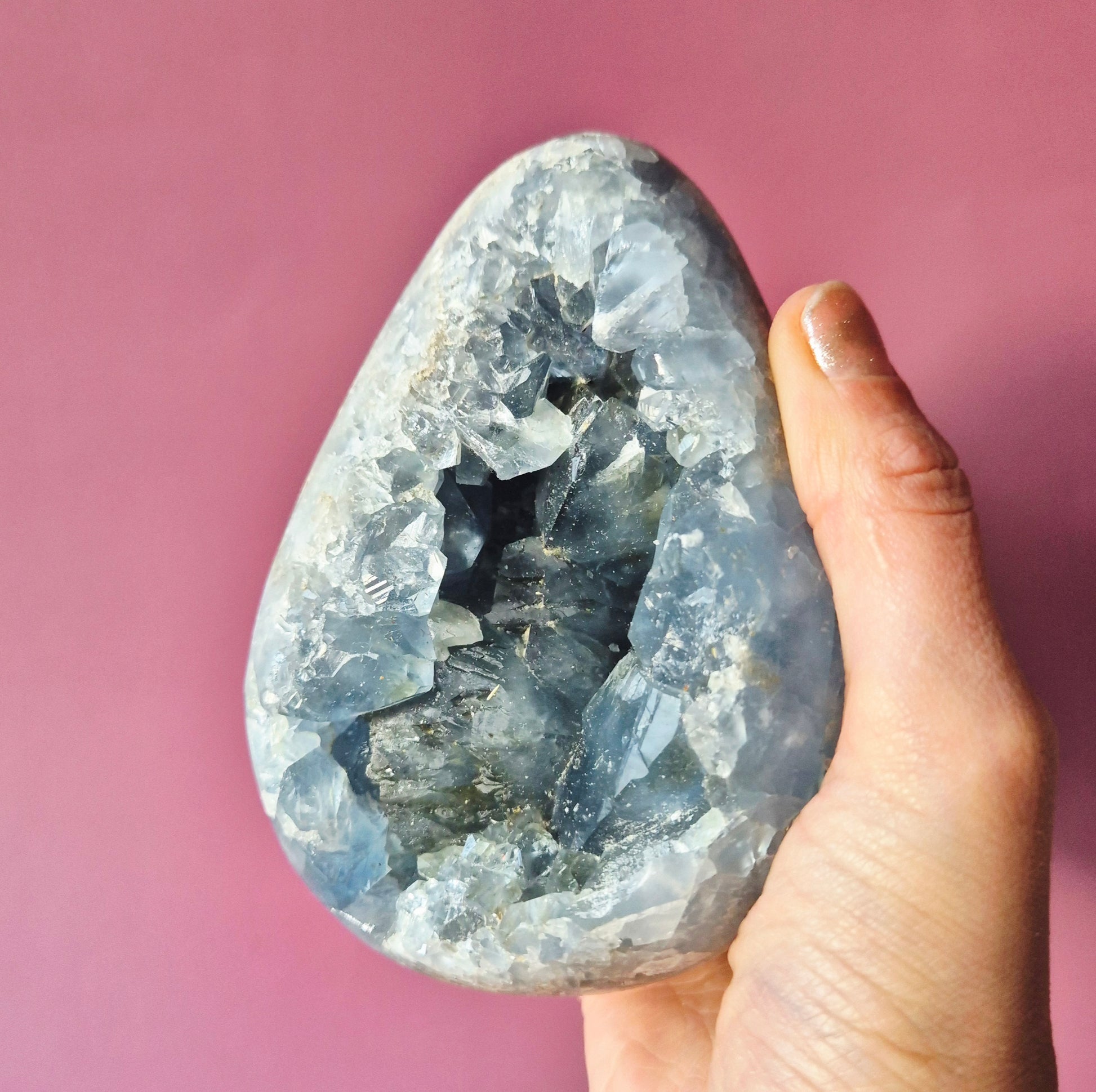 Elke Celestien geode is volledig uniek in kristalstructuur, kleurintensiteit en tekening – je ontvangt dus altijd een one of a kind specimen.
