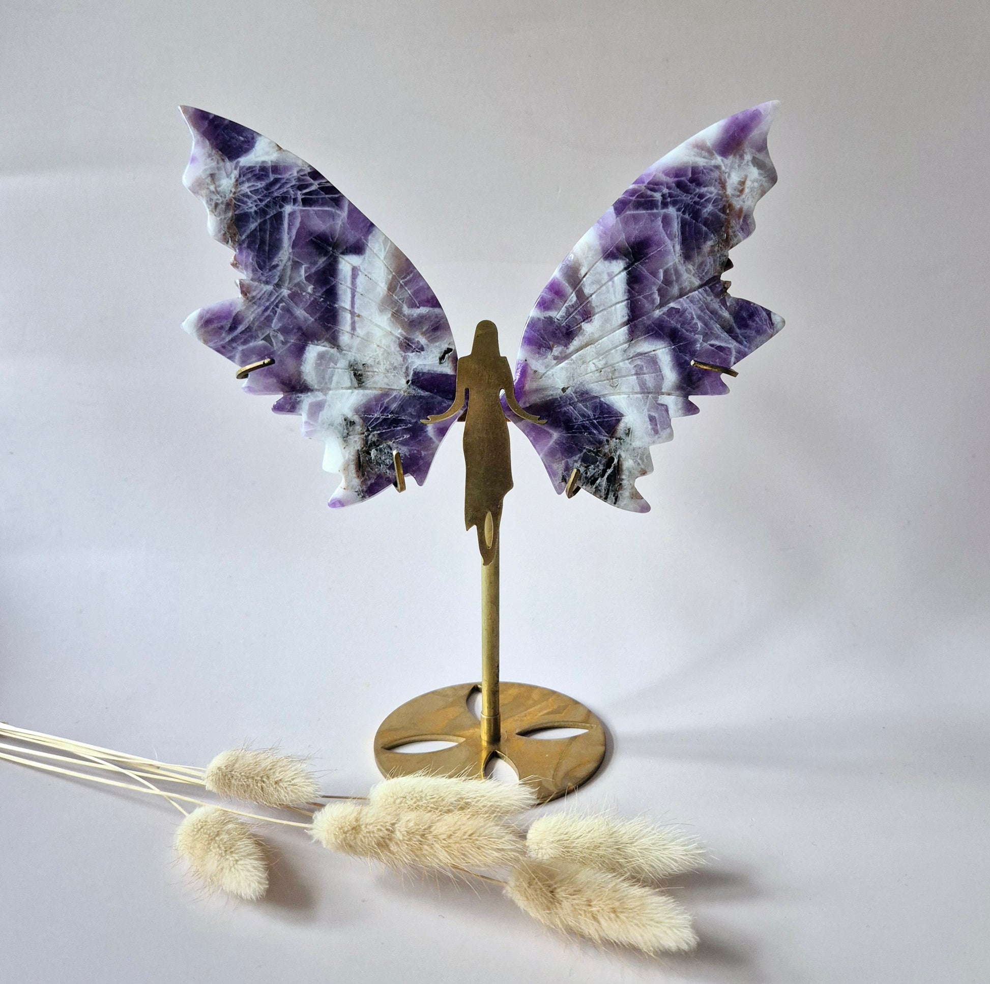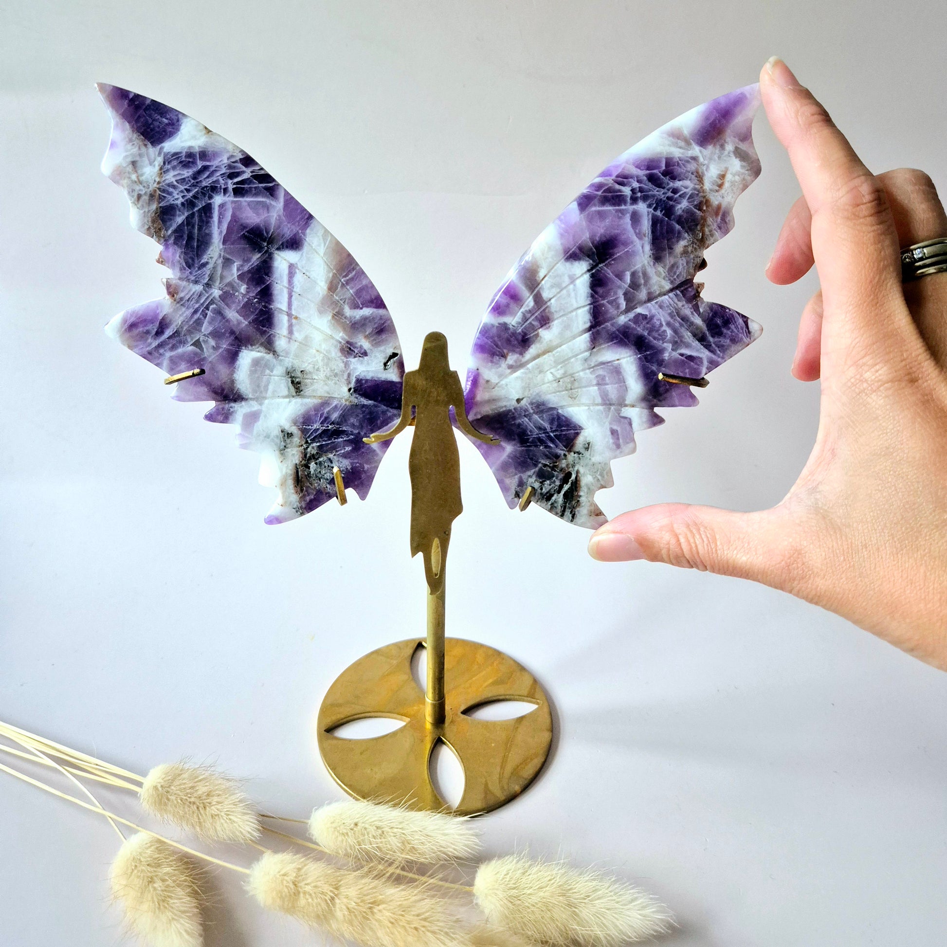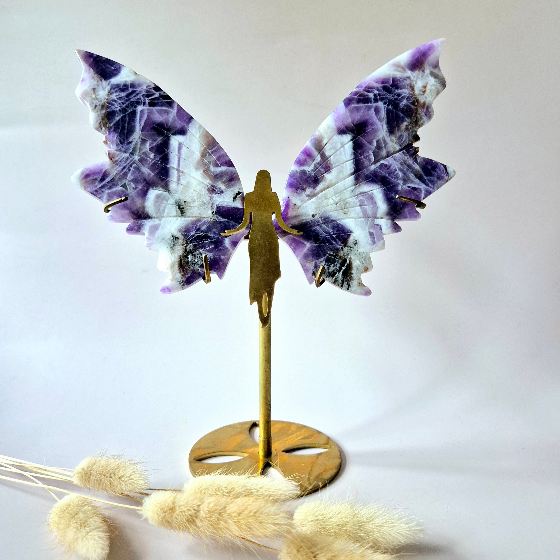 Laat je betoveren door deze XL Dream Amethist Fee met handgesneden vleugels van Dream Amethist en een elegante messing standaard. De fee straalt een zachte, beschermende energie uit en brengt harmonie in elke ruimte. Amethist staat bekend om rust, intuïtie en spirituele groei, waardoor dit kunstwerk niet alleen een decoratief pronkstuk is, maar ook een spirituele begeleider.