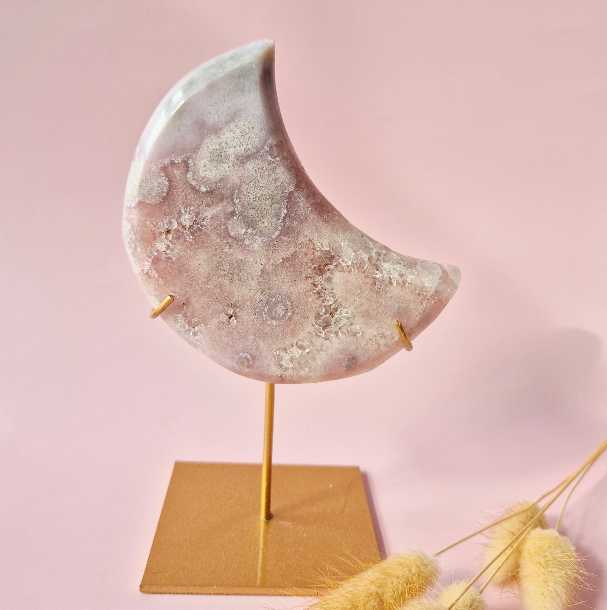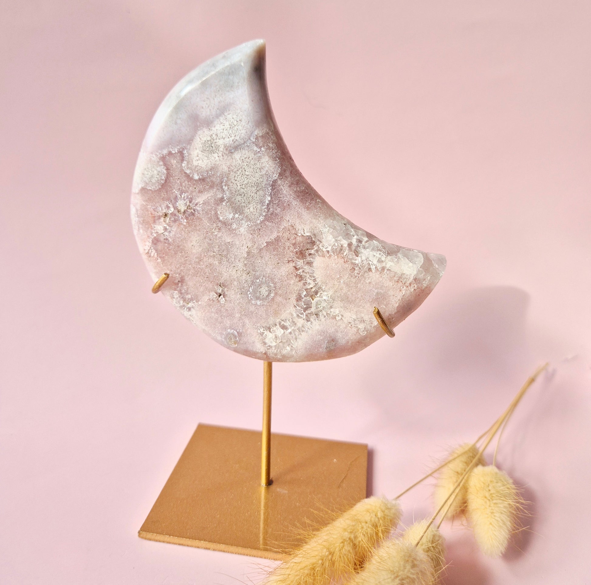 Roze Amethist staat bekend om haar zachte, kalmerende energie en wordt geassocieerd met emotionele heling, zelfliefde en innerlijke rust. De maan symboliseert intuïtie, vrouwelijke energie en cyclische groei, waardoor dit stuk perfect past in een altaar- of meditatieplek.