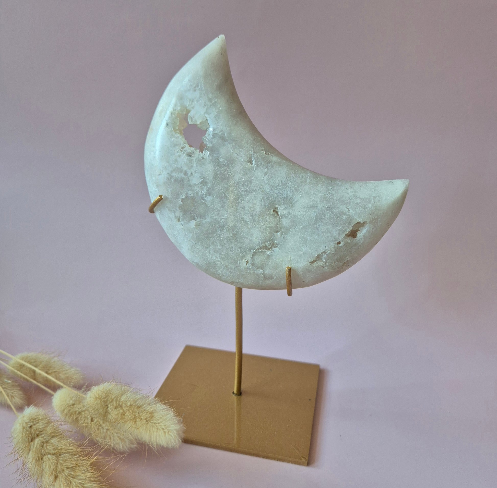 Roze Amethist staat bekend om haar zachte, kalmerende energie en wordt geassocieerd met emotionele heling, zelfliefde en innerlijke rust. De maan symboliseert intuïtie, vrouwelijke energie en cyclische groei, waardoor dit stuk perfect past in een altaar- of meditatieplek.