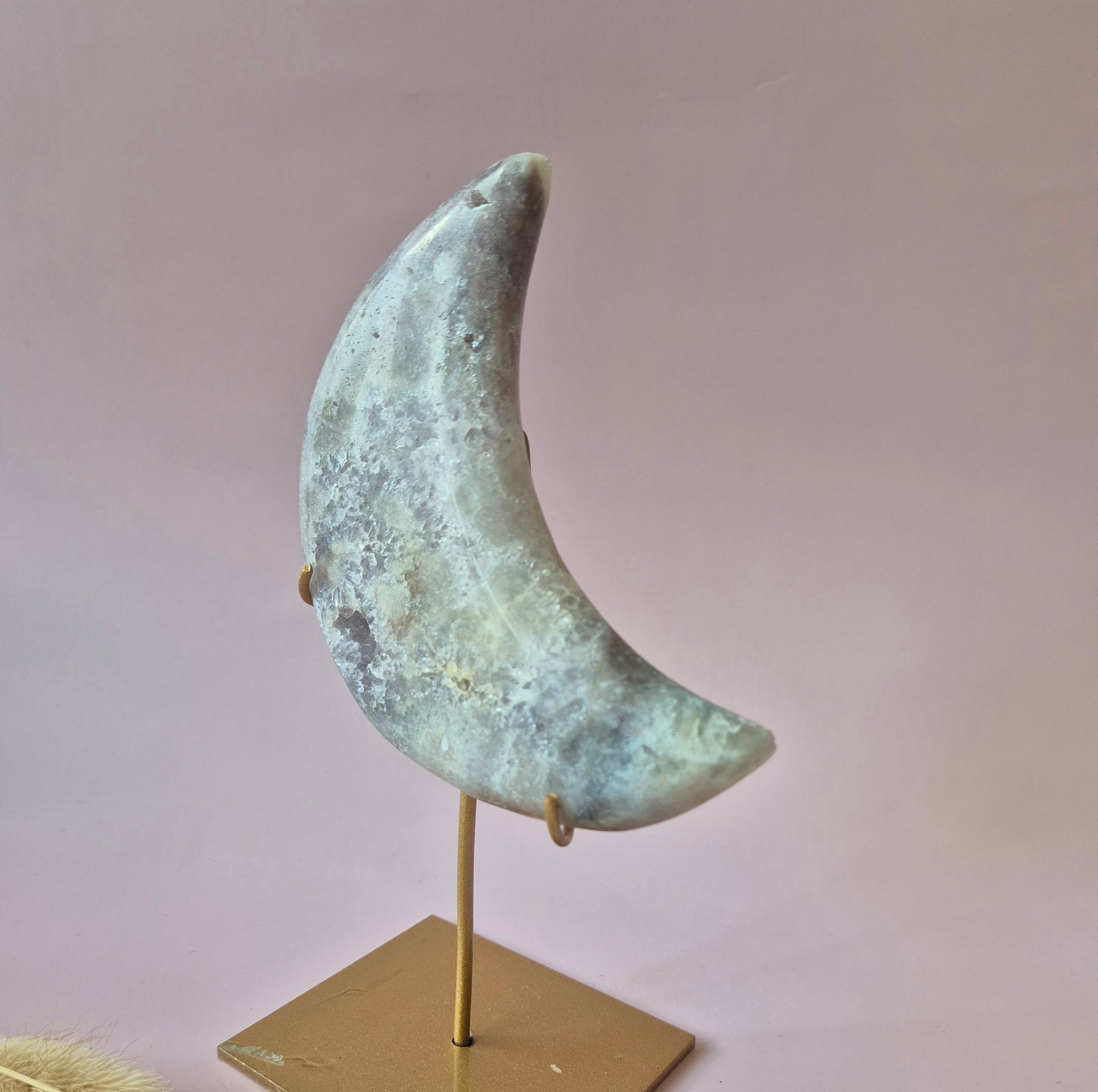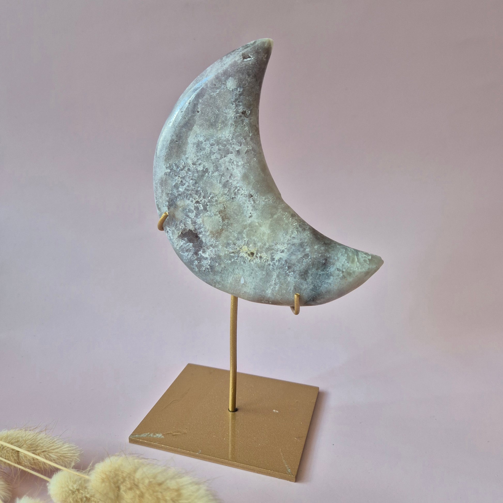 Roze Amethist staat bekend om haar zachte, kalmerende energie en wordt geassocieerd met emotionele heling, zelfliefde en innerlijke rust. De maan symboliseert intuïtie, vrouwelijke energie en cyclische groei, waardoor dit stuk perfect past in een altaar- of meditatieplek.