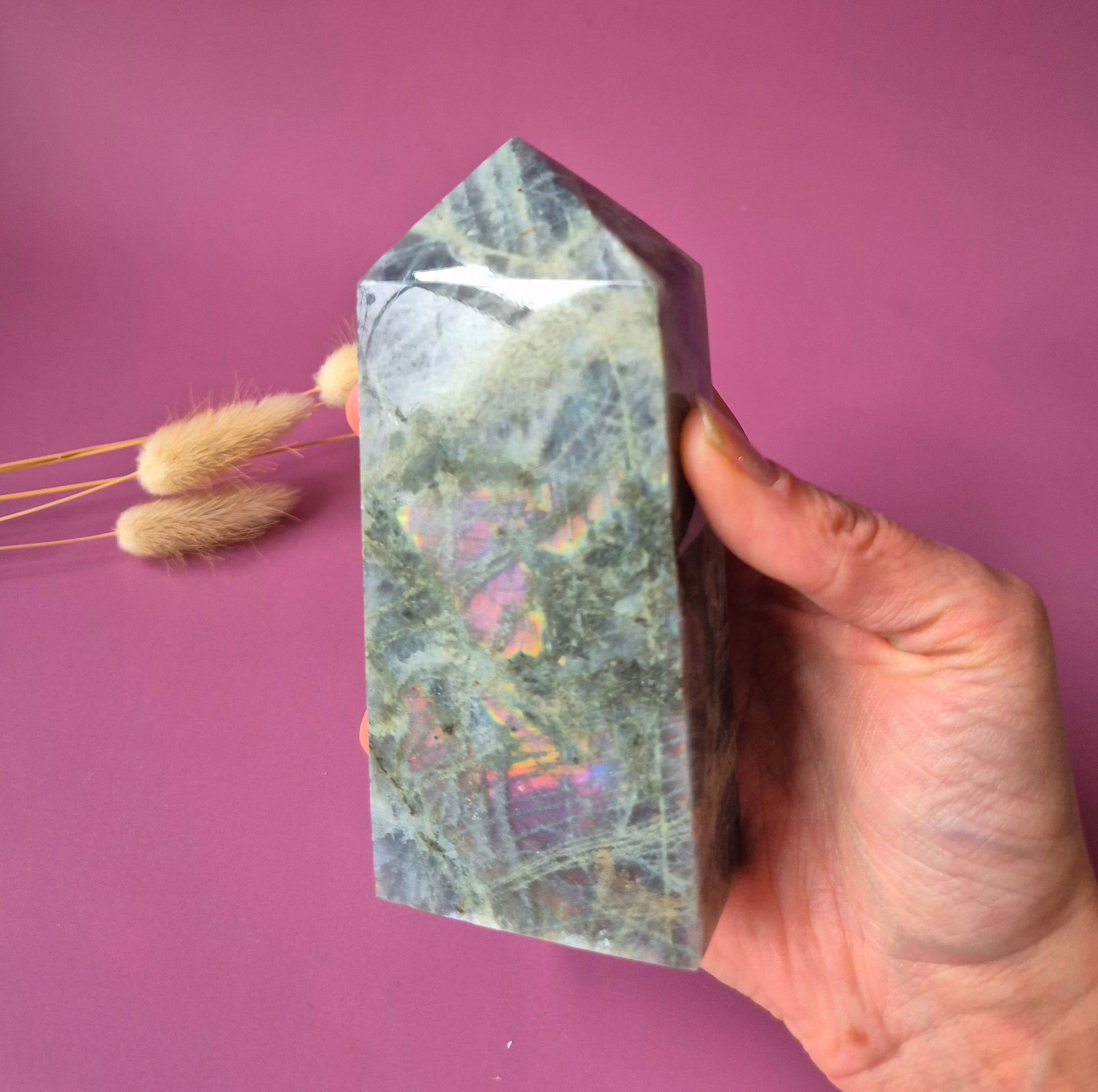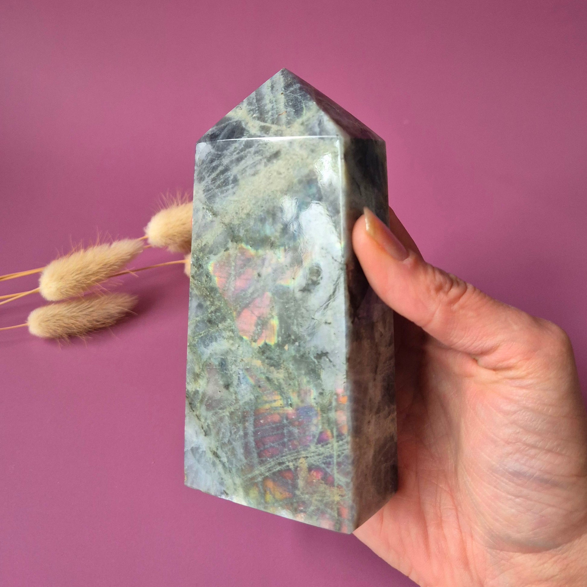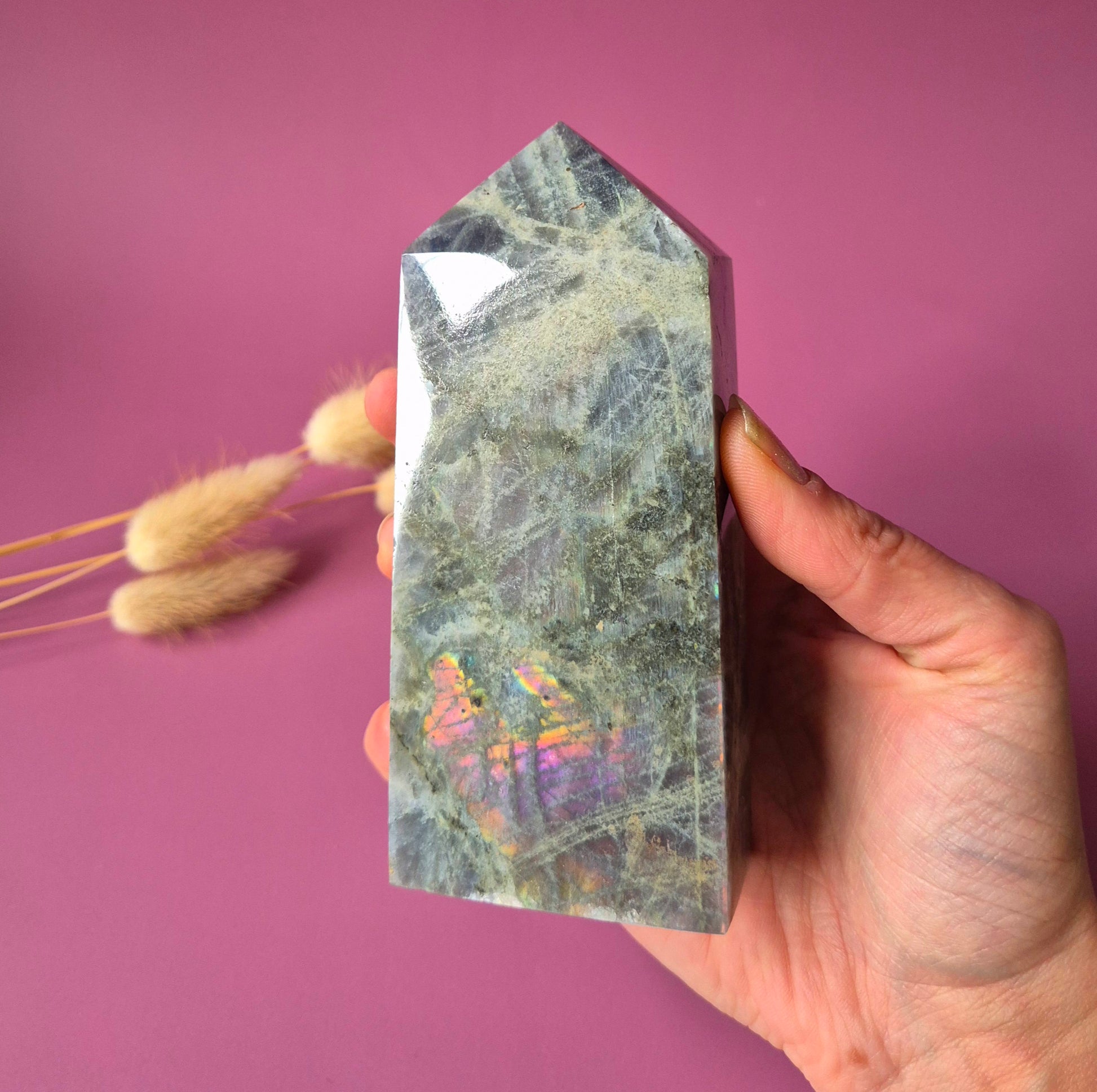 Deze unieke labradoriet tower is een echt verzamelstuk. De steen toont een zeldzame paarse labradorescentie, gecombineerd met prachtige rainbow flashes in tinten oranje, roze, goud en blauw.
