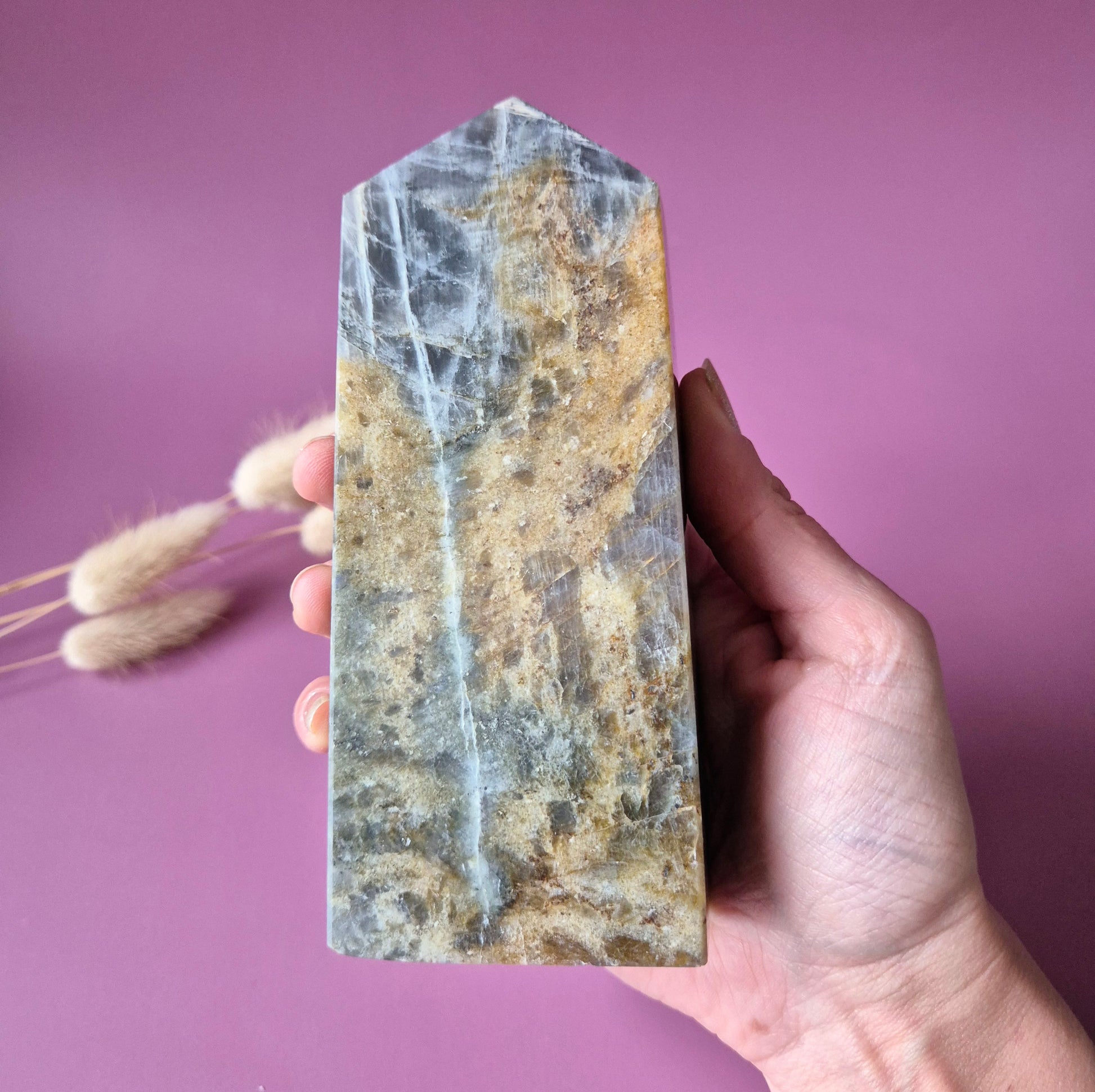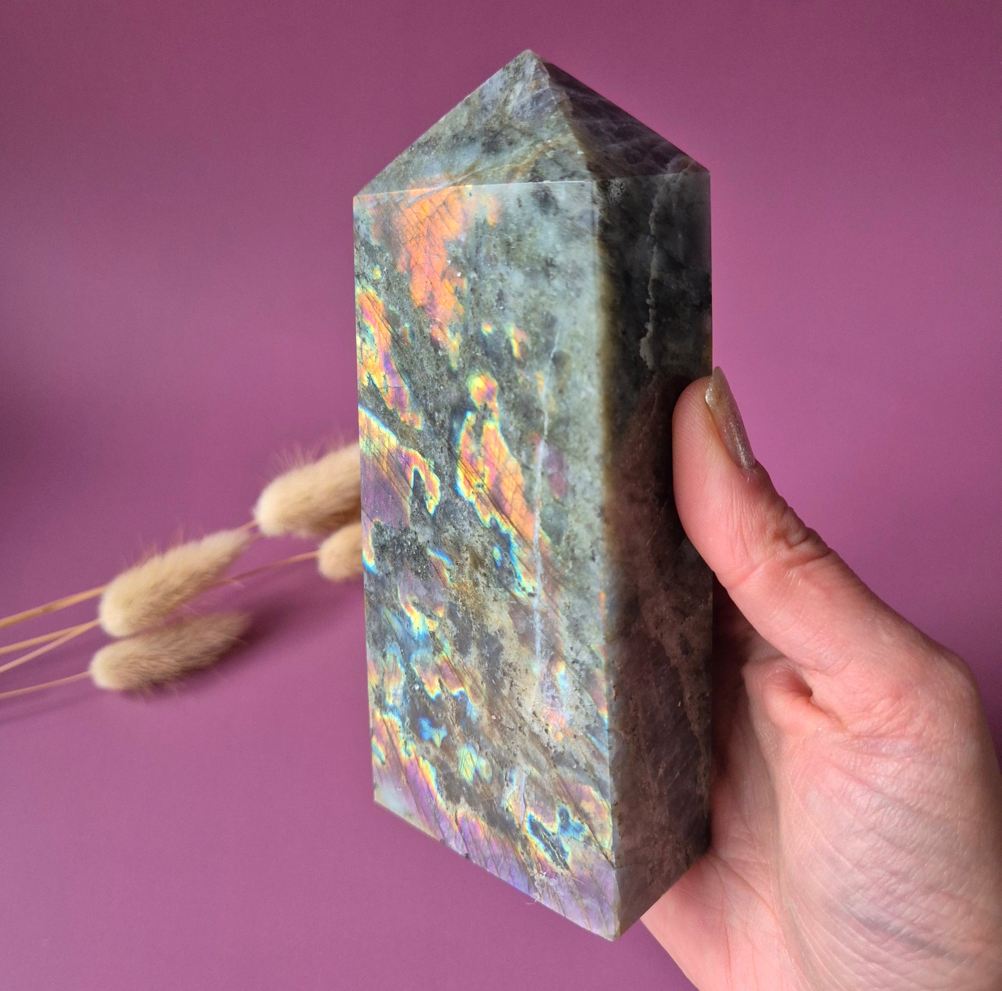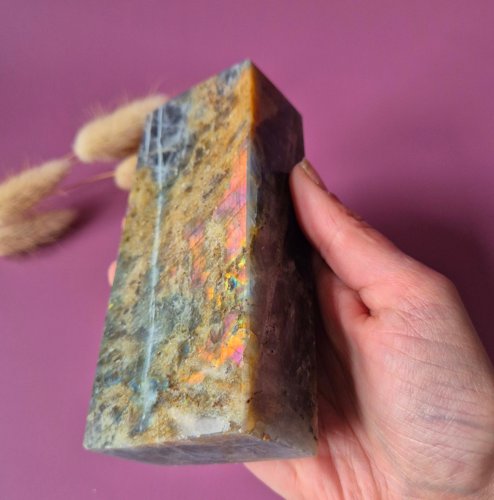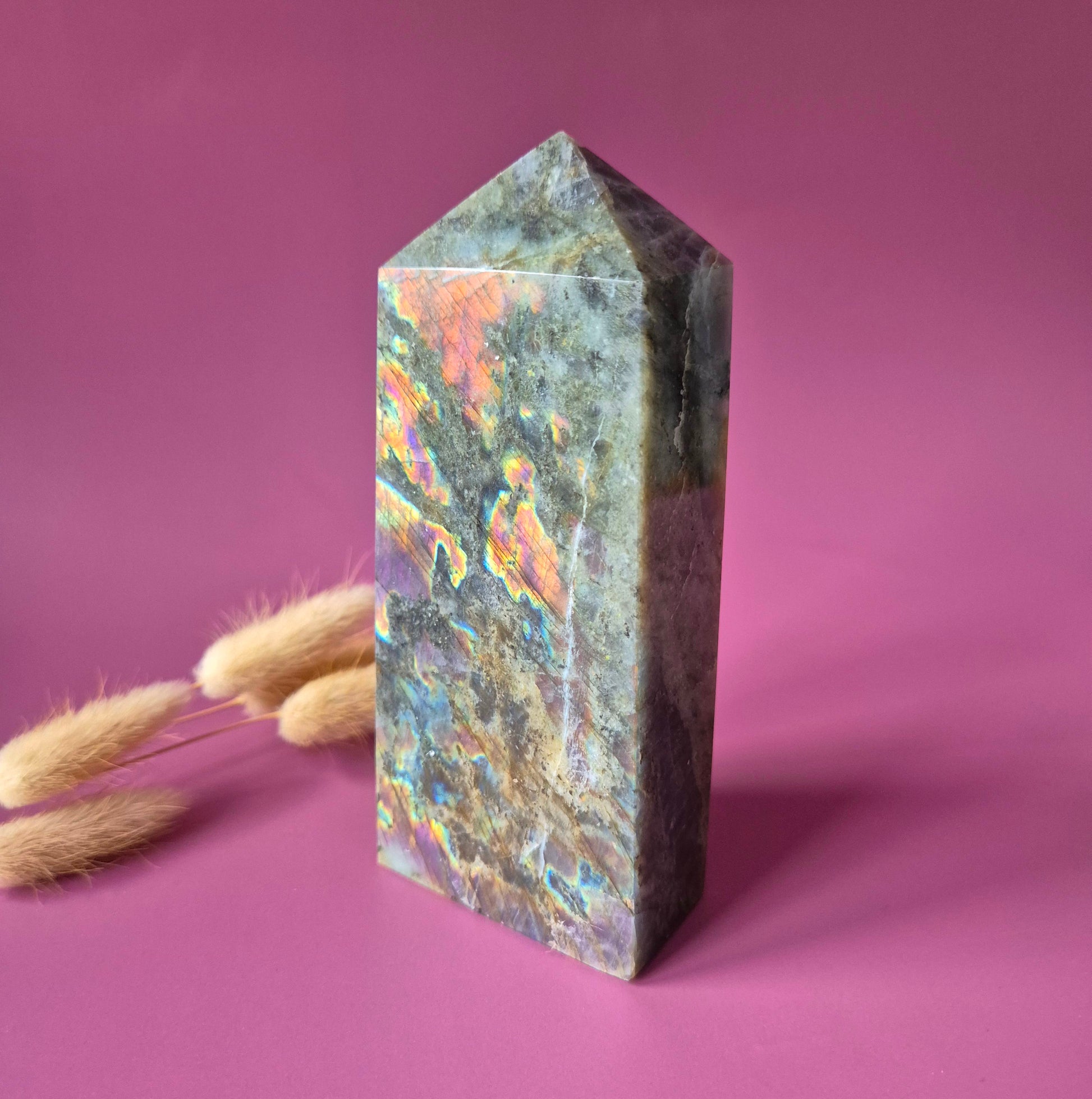 Deze unieke labradoriet tower is een echt verzamelstuk. De steen toont een zeldzame paarse labradorescentie, gecombineerd met prachtige rainbow flashes in tinten oranje, roze, goud en blauw.