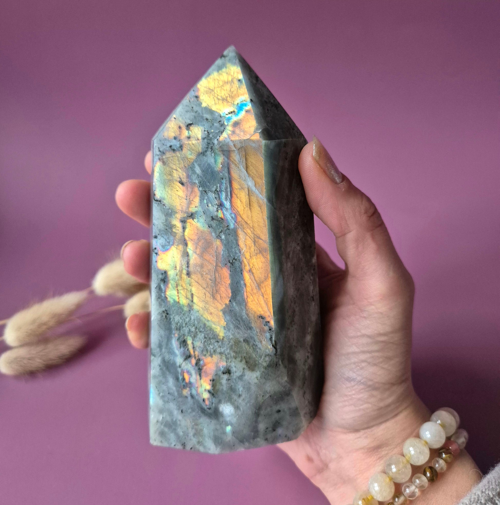 XL Edelsteen Paarse / Oranje Labradoriet Tower met Regenboog Flash – 646g