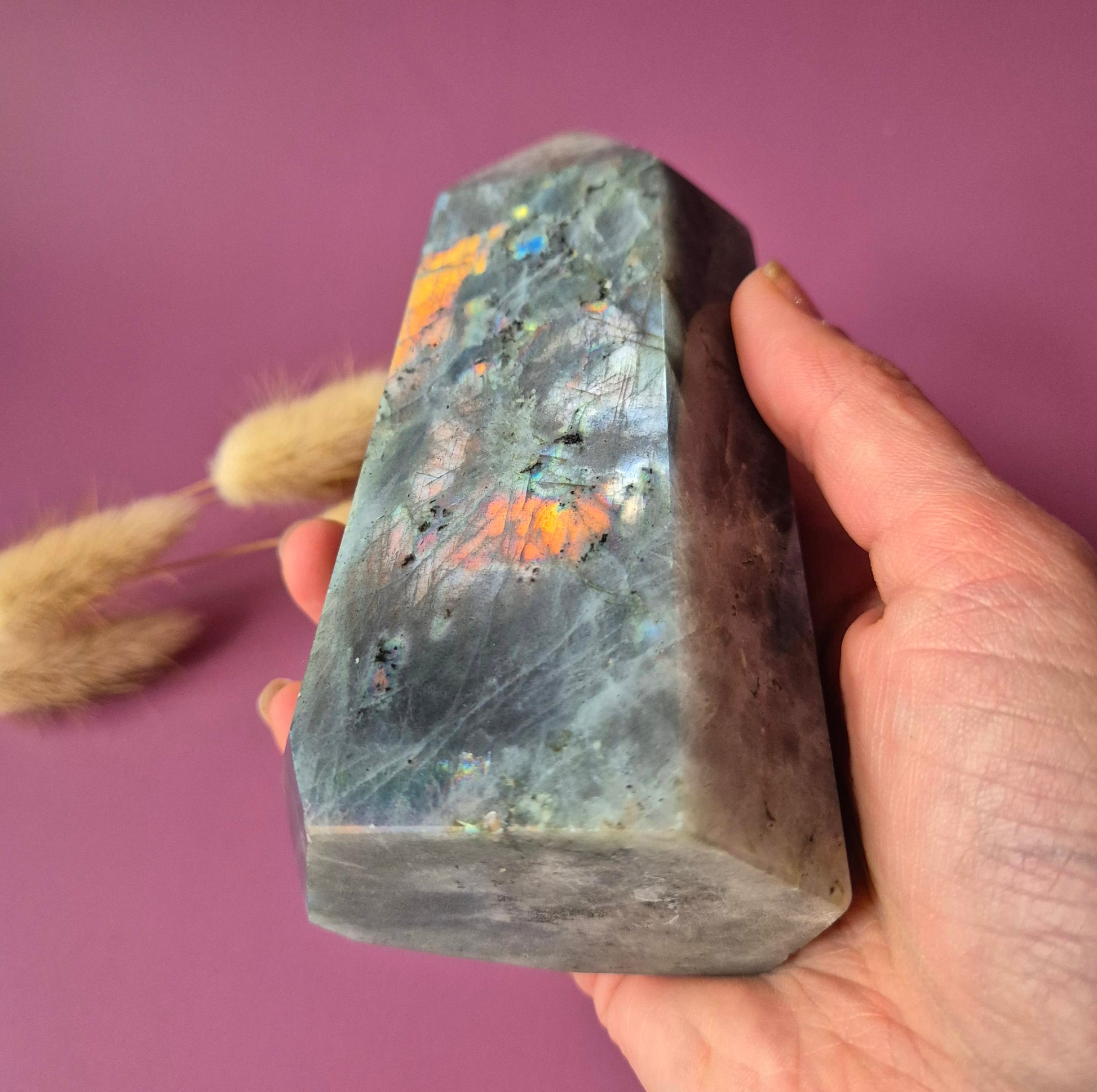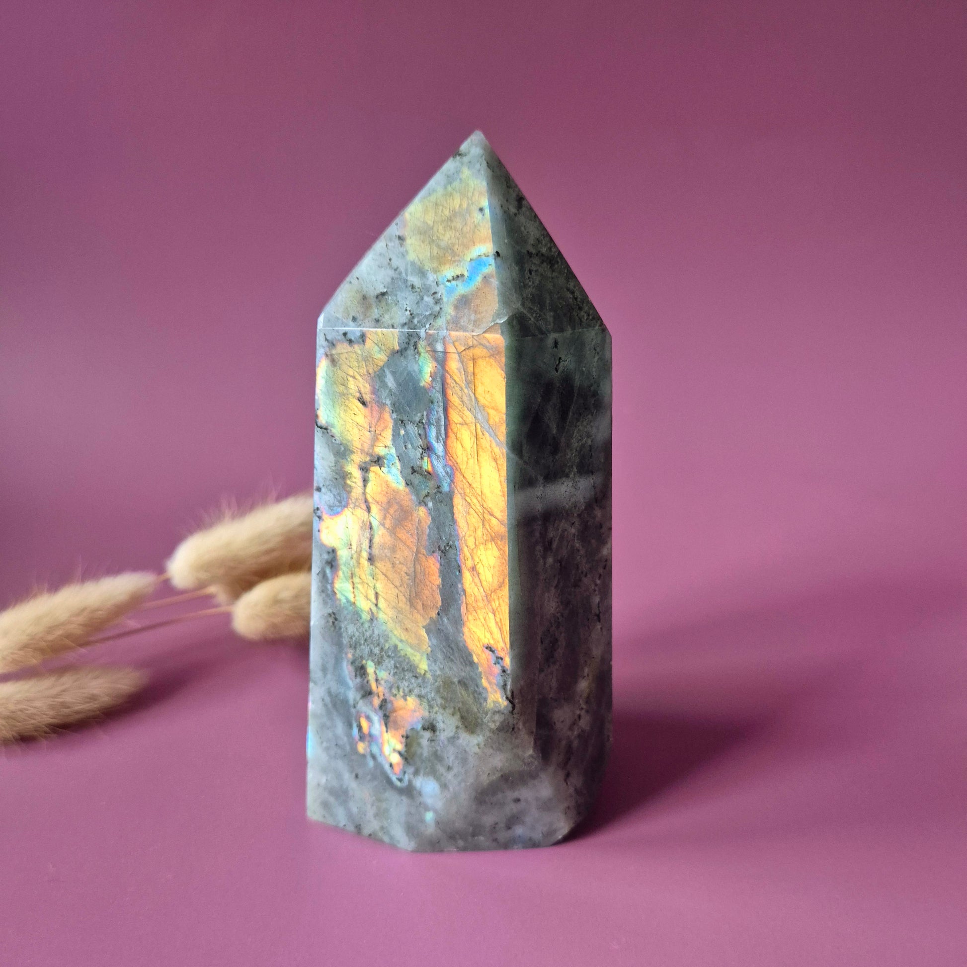 Deze unieke labradoriet tower is een echt verzamelstuk. De steen toont een zeldzame paarse labradorescentie, gecombineerd met prachtige rainbow flashes in tinten oranje, roze, goud en blauw.
