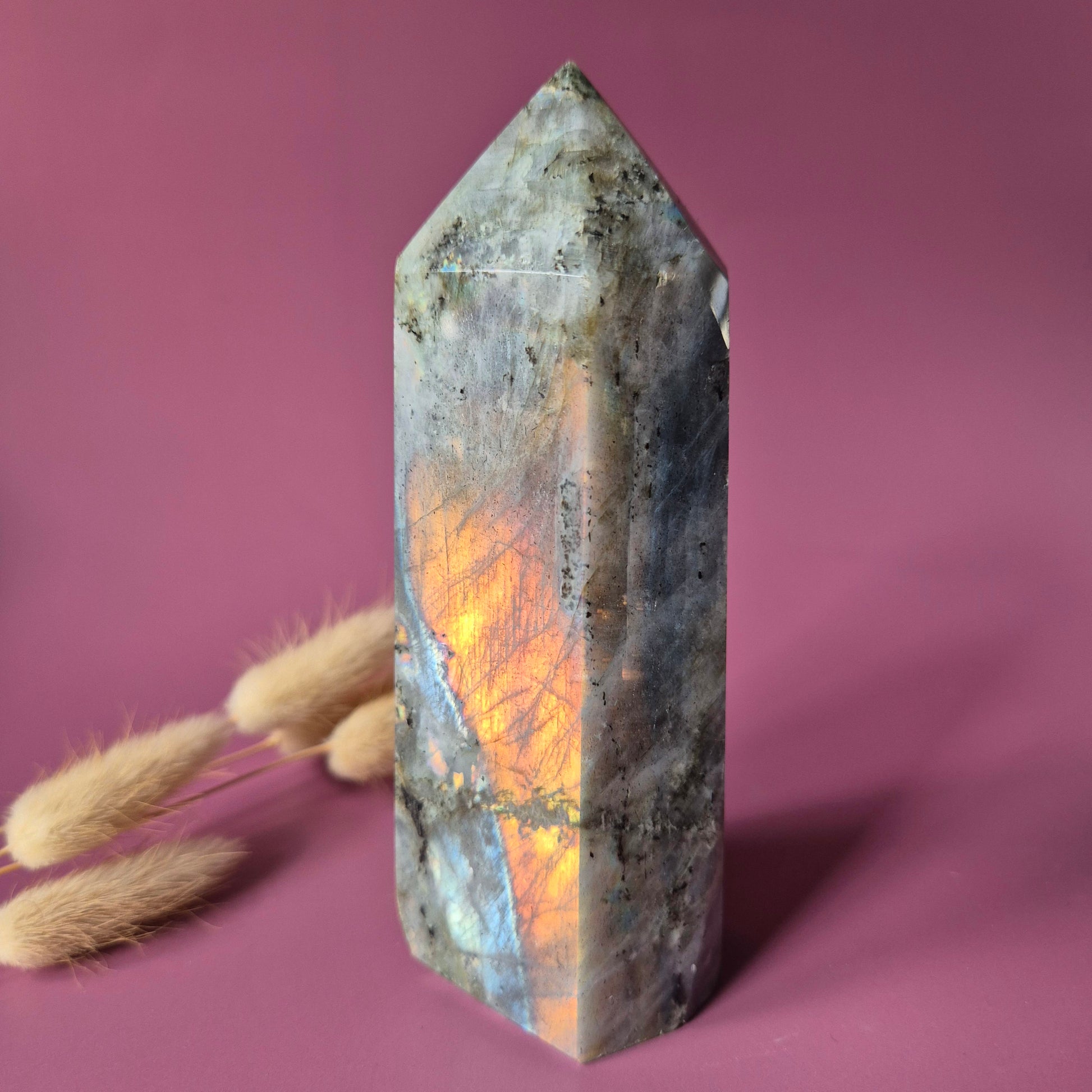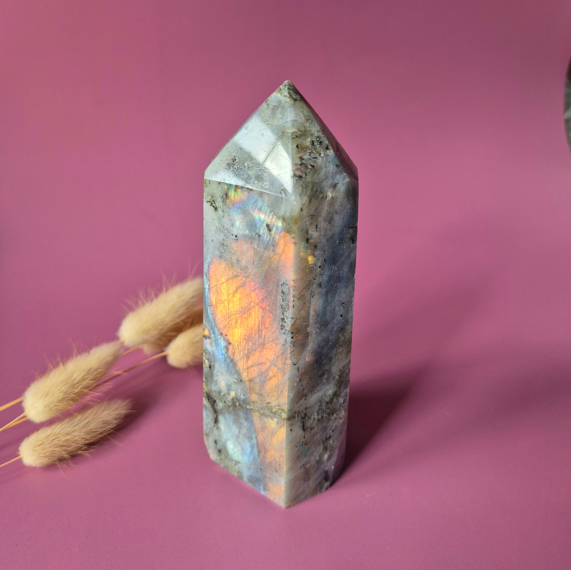 Deze unieke labradoriet tower is een echt verzamelstuk. De steen toont een zeldzame paarse labradorescentie, gecombineerd met prachtige rainbow flashes in tinten oranje, roze, goud en blauw.