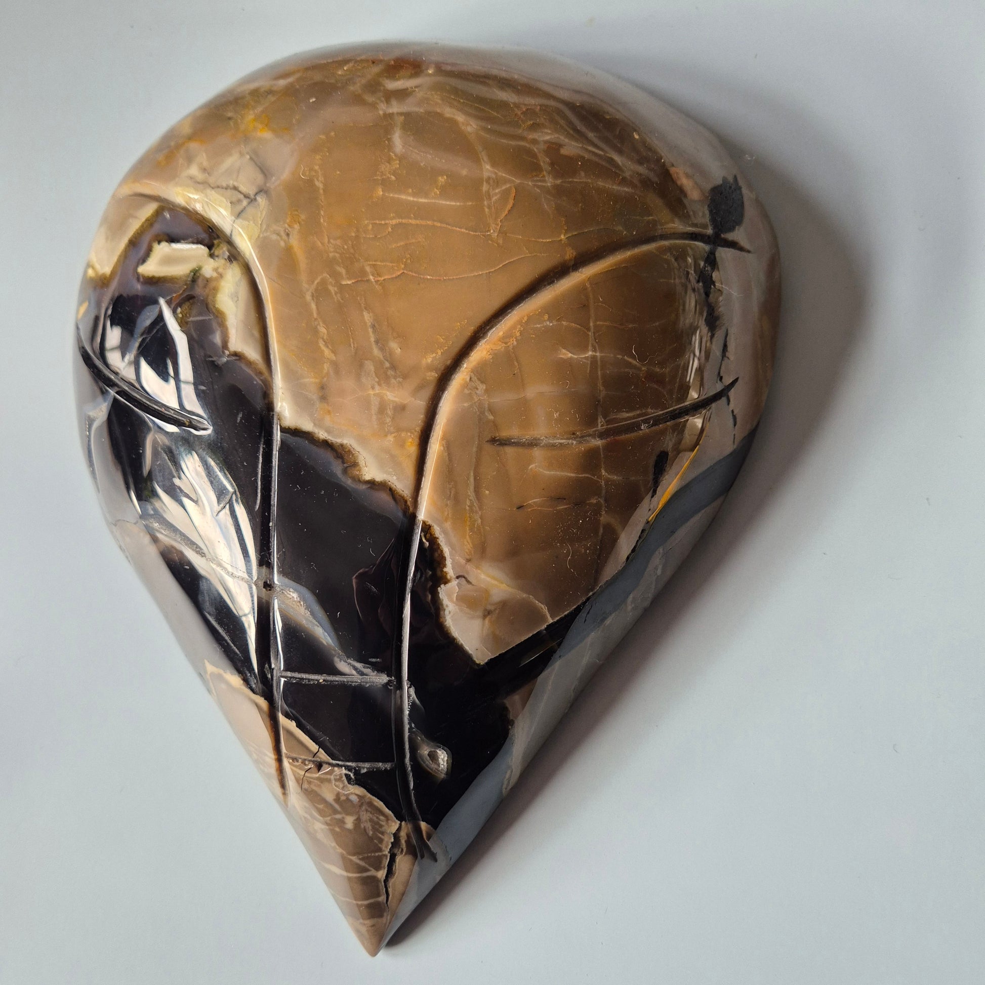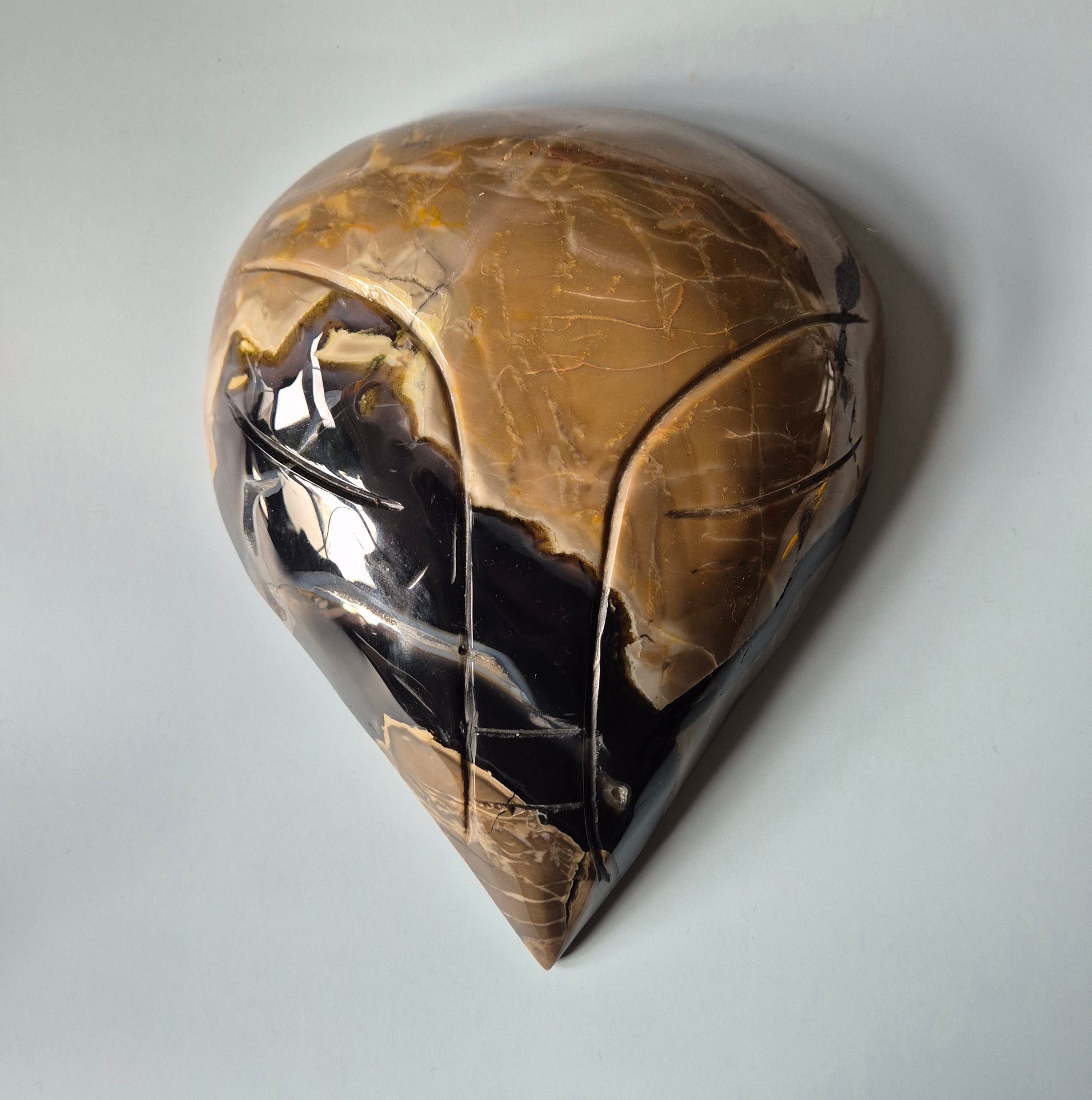 Deze indrukwekkende Volcano Agate sculptuur van maar liefst 3 kg is een krachtig statement piece met een bijna vulkanische uitstraling. De steen kenmerkt zich door diepe zwart-, crème- en aardetinten met natuurlijke aders en lagen die doen denken aan gestolde lava en aardse beweging. De organische vormen en vloeiende lijnen geven dit stuk een sculpturale, bijna meditatieve uitstraling.