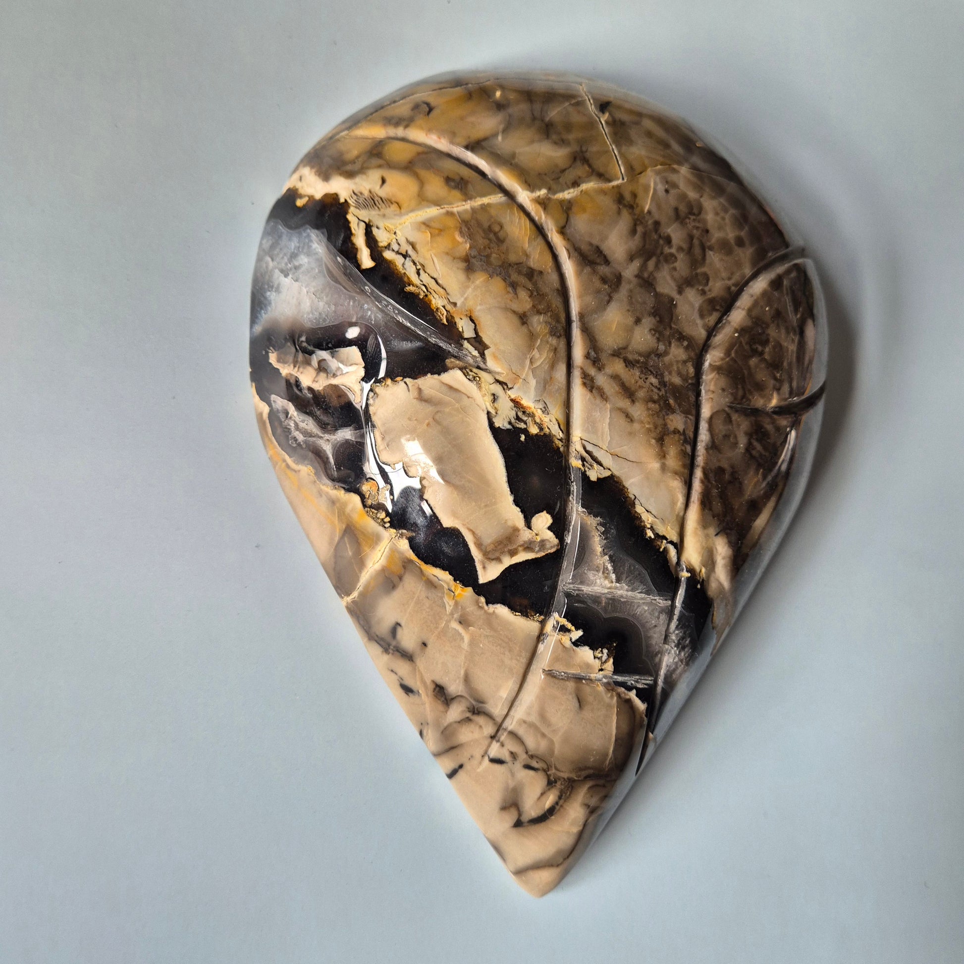 Deze indrukwekkende Volcano Agate sculptuur van maar liefst 3 kg is een krachtig statement piece met een bijna vulkanische uitstraling. De steen kenmerkt zich door diepe zwart-, crème- en aardetinten met natuurlijke aders en lagen die doen denken aan gestolde lava en aardse beweging. De organische vormen en vloeiende lijnen geven dit stuk een sculpturale, bijna meditatieve uitstraling.