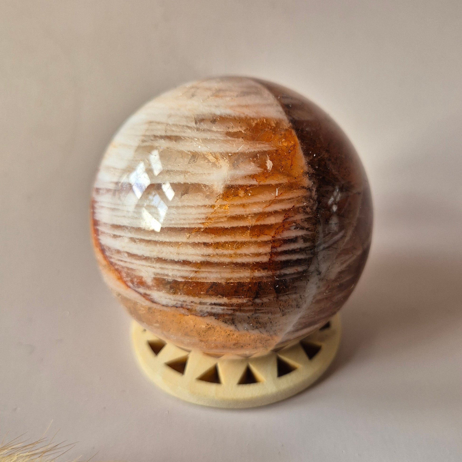 Deze krachtige Fire Quartz bol – ook bekend als Hematoide Kwarts – is een ware bron van energie, focus en bescherming. Met haar vurige rode tinten, die ontstaan door insluitsels van hematiet in helder kwarts, brengt deze bol zowel vitaliteit als innerlijke rust. Perfect om blokkades te doorbreken, negatieve energie te transformeren en meer balans te vinden tussen hoofd en hart.