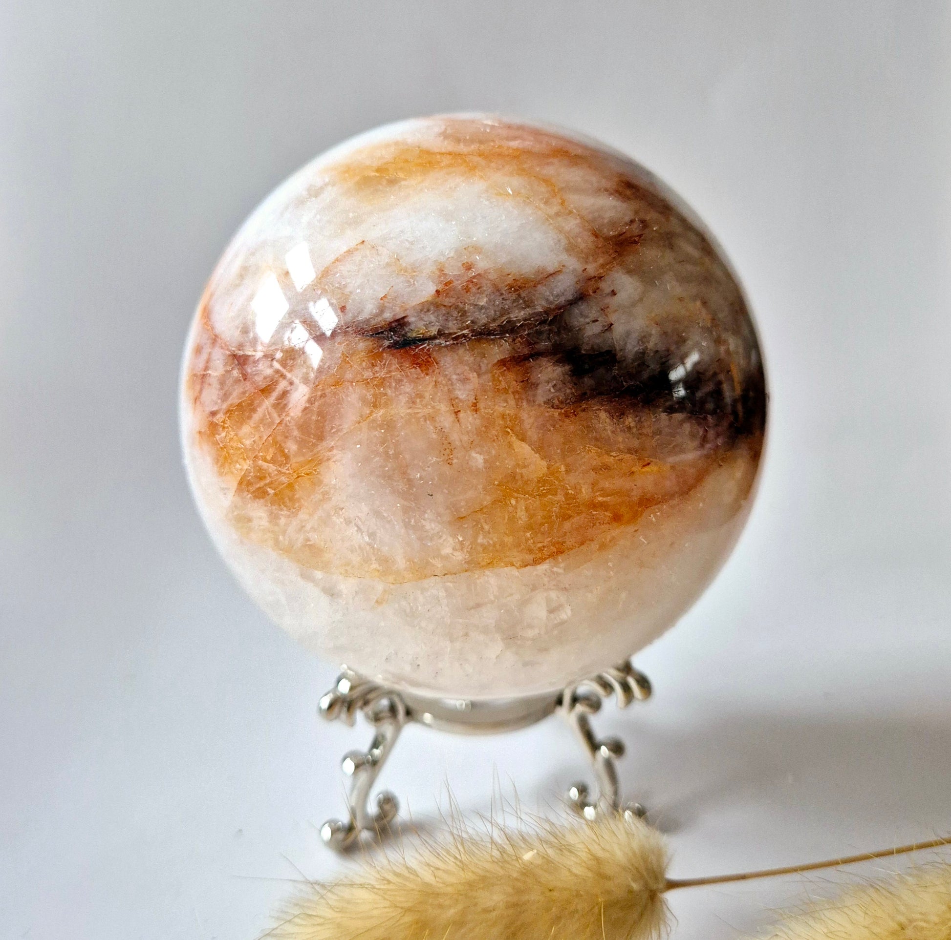 Deze krachtige Fire Quartz bol – ook bekend als Hematoide Kwarts – is een ware bron van energie, focus en bescherming. Met haar vurige rode tinten, die ontstaan door insluitsels van hematiet in helder kwarts, brengt deze bol zowel vitaliteit als innerlijke rust. Perfect om blokkades te doorbreken, negatieve energie te transformeren en meer balans te vinden tussen hoofd en hart.