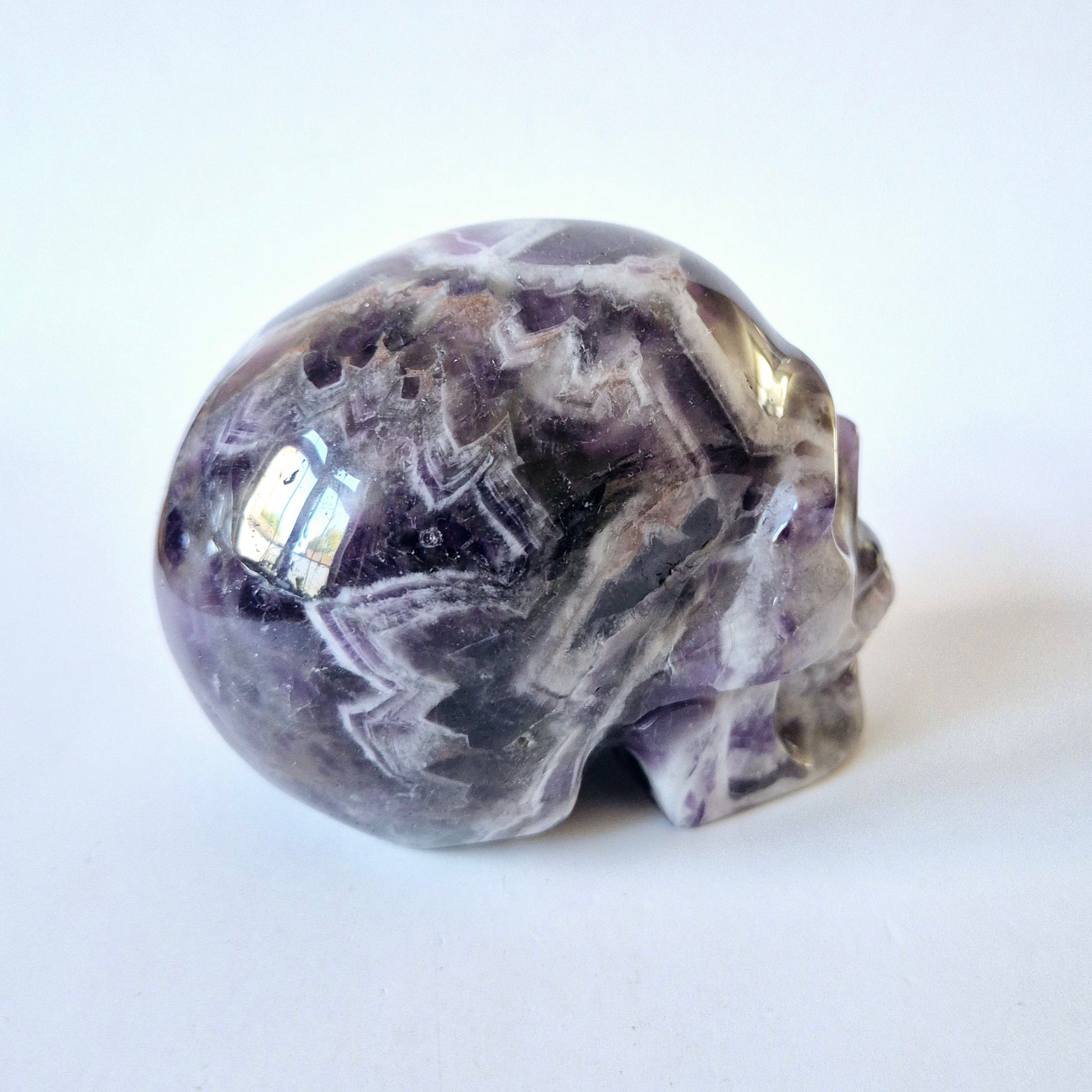 Deze handgeslepen schedel van Dream Amethist van 440 gram is een krachtig statement piece. Dream Amethist, ook wel Chevron Amethist genoemd, combineert diepe paarse tinten met witte kwartsbanden in een natuurlijk zigzagpatroon. Deze steen staat bekend om zijn spirituele bescherming, intuïtieversterking en rustgevende werking. Perfect voor altaren, healingpraktijken of als decoratief kunstwerk met een spirituele betekenis. Elk stuk is uniek en met zorg gepolijst voor een gladde, glanzende afwerking.