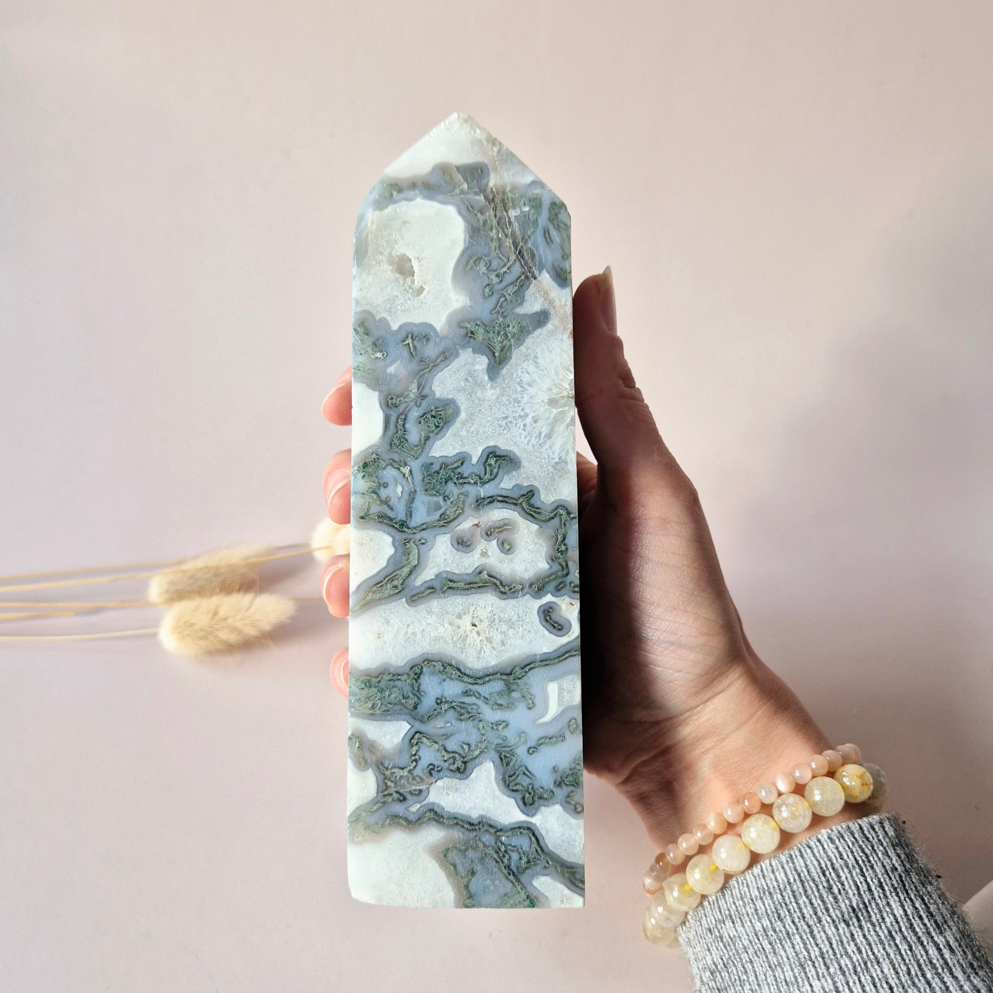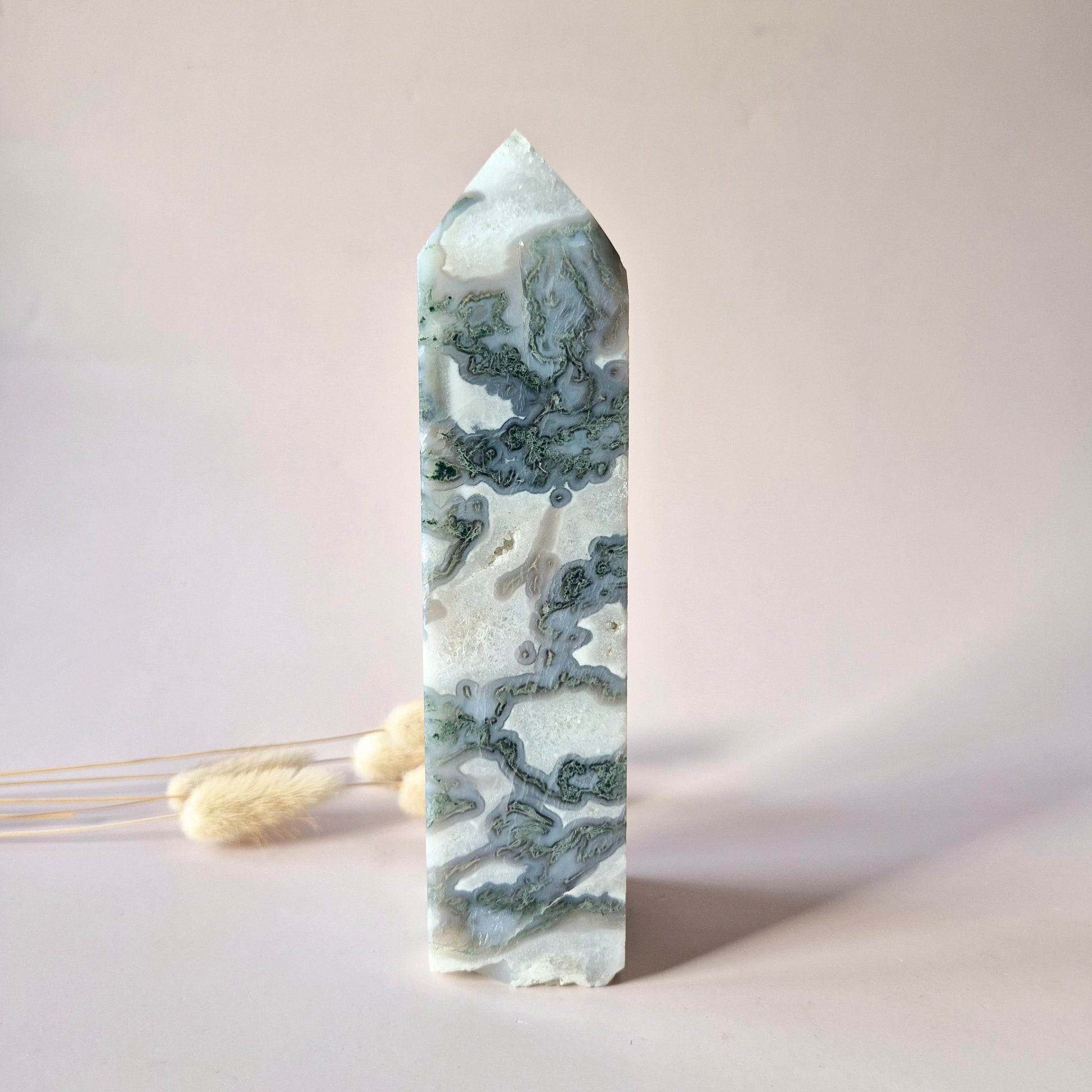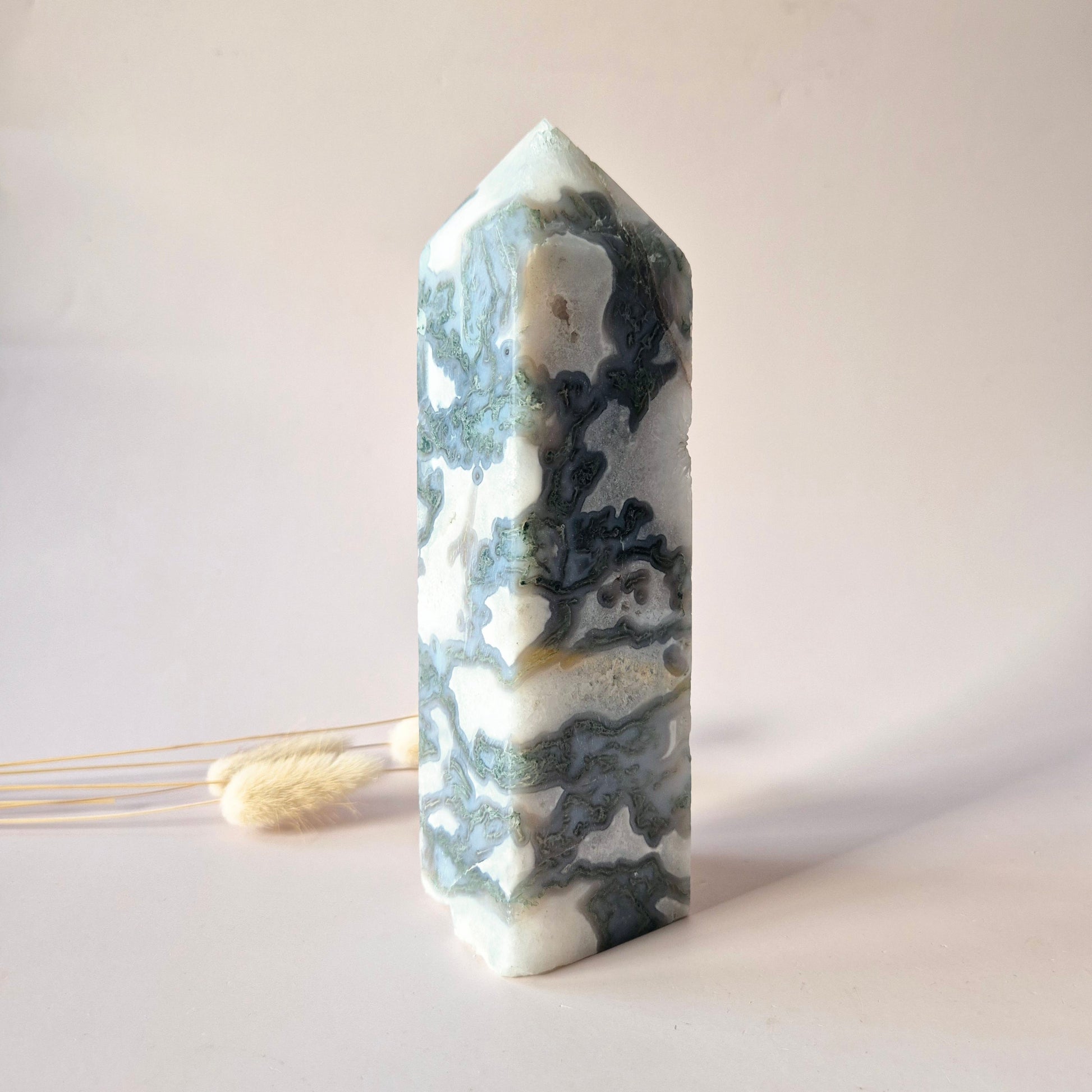 Mosagaat staat bekend als een steen van groei, stabiliteit en natuurlijke harmonie. Zijn aardende energie brengt rust, balanceert emoties en stimuleert een gevoel van verbinding met de natuur. Deze toren is ideaal voor woonkamers, werkruimtes, healingpraktijken en altaren waar je een krachtige, serene atmosfeer wilt creëren.